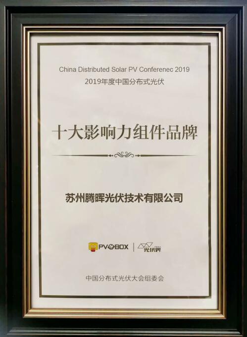 2020年7月2日,第三屆中國(guó)分布式光伏大會(huì)在山東濟(jì)南成功舉辦。騰暉光伏憑借自己高功率、高質(zhì)量、高發(fā)電量的組件產(chǎn)品、全球領(lǐng)先的光伏電站開(kāi)發(fā)實(shí)力、在中國(guó)分布式光伏市場(chǎng)上的不斷專注投入及“光伏+”模式應(yīng)用上的不斷創(chuàng)新和應(yīng)用,斬獲“2019年度中國(guó)分布式光伏十大影響組件品牌”大獎(jiǎng)。這也是騰暉光伏繼2017年、2018年獲獎(jiǎng)之后,第三次獲此殊榮。